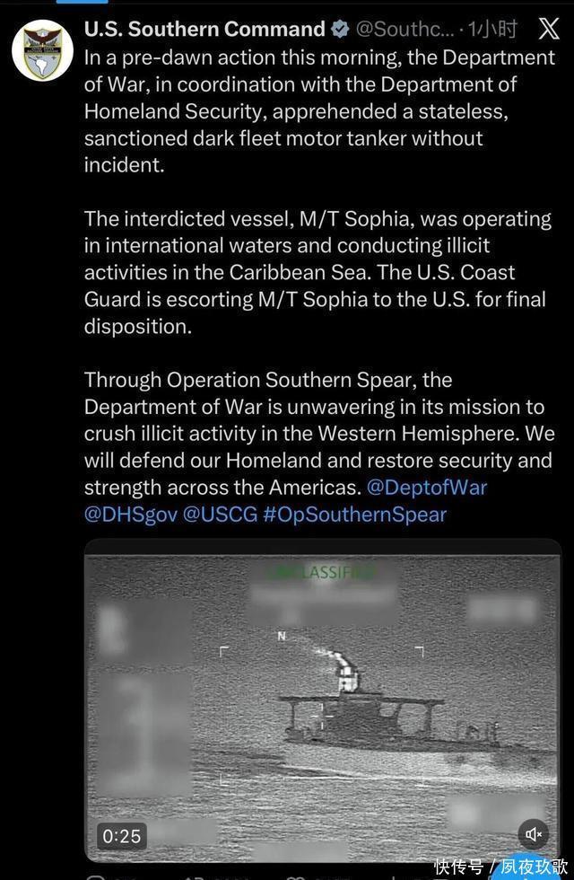 1月7日,特朗普一声令下,好意思军从天而下,在北大泰西阻扰了一艘吊挂俄罗斯国旗的油轮,约半个小时后,又扣押了一艘无国籍油轮,情理是它们“违抗了好意思国制裁”。