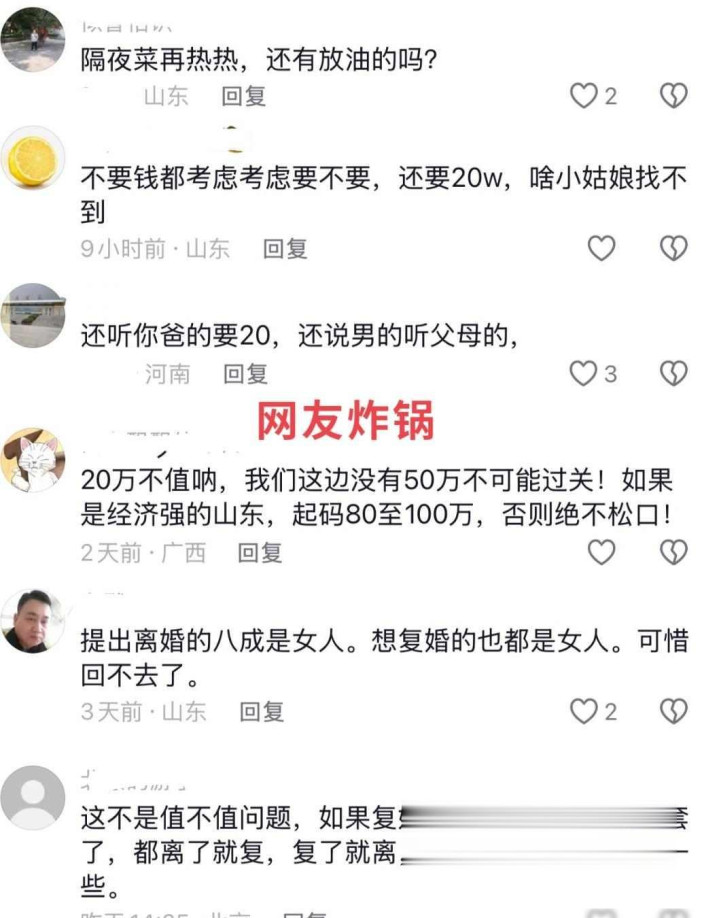 2月山东有个讯息传出来,36岁的李姐思跟前夫复婚,恶果她爸提了20万彩礼。这事网上吵翻了天,批驳里七成东谈主齐扶持前夫。说真实的,这事儿看着挺矛盾,为啥这样说呢?