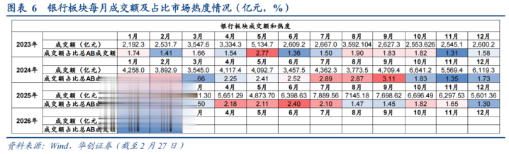 2026岁首银行板块热度较去年有所下降,银行板块来去占比同比下降0.12pct至1.16%。截止2月27日,由于春节假期错位且商场风偏训导,银行板块成交额同比下降11.3%,占比AB股商场总成交额1.16%,环比握平,同比下降0.12pct。