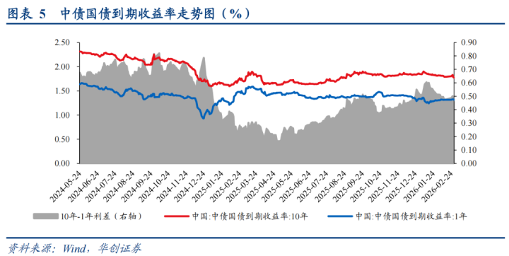 2026年2月,10年期国债利率震撼下行,1年期国债利率保握默契。2月,10年期国债利率从月初1.82%下行至月末的1.78%水平,或主要由于流动性宽松以及货币策略宽松预期。1年期国债利率则保握在1.31%掌握。