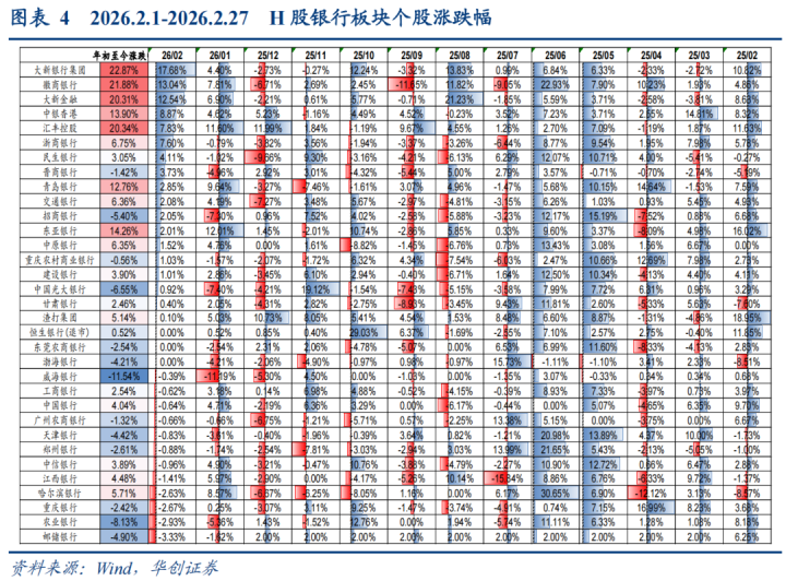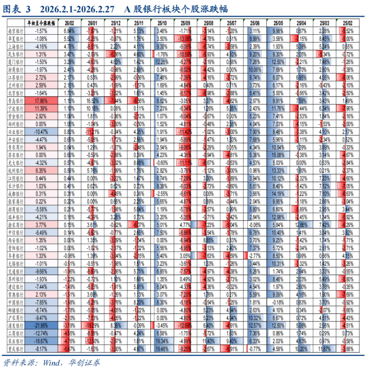 2月1日至2月27日,绩优城商行与低估股份行领涨。涨幅靠前的银举止南京银行(+6.84%)、中原银行(+5.52%)、上海银行(+4.76%)、民生银行(+3.47%)、厦门银行(+3.29%)。跌幅较多的主如果重庆银行(-6.67%)、农业银行(-4.76%)、工商银行(-4.55%)、浦发银行(-3.19%)、沪农商行(-2.10%)。