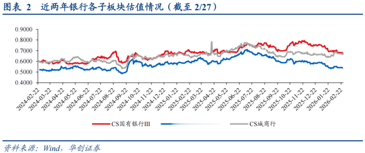 具体看银行细分板块,2026年2月上旬,各子板块估值均有所上升,但春节假期之后,估值则有所回调。概括来看,国有行PB估值从月初的0.70X降至月末0.67X掌握,股份行的PB估值月初月末均在0.54X掌握,城商行PB估值从月初0.65X上升至月末0.67X掌握。