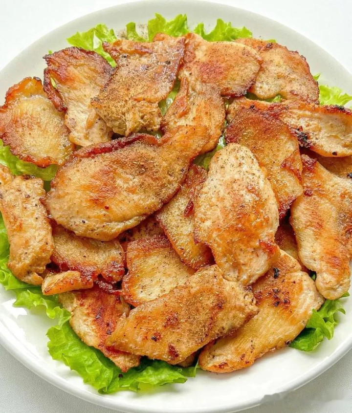 2. 锅中放极少油,小火将鸡胸肉煎至两面金黄熟透。