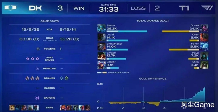 先赢两把,接着连输三把,T1创队于今,这种情况也只出现过两次,上一次还要追念到10年前,S6夏令赛季后赛打KT的时候,被让二追三过一次,没念念到本年第一赛段,又出现这种剧情了,整场比赛看下来,Oner和Peyz的景色,是确凿很差,打野拼惩责拼不外,AD把把下路对线炸穿。