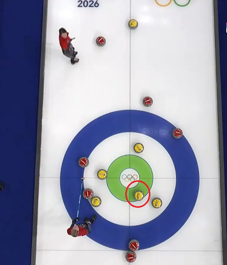 第8局,中国队先手,四垒王芮的第一投,将好意思国队的红壶往外磕了少量,这么,造成了离圆心最近的4颗壶沿路是中国队的完整花样。
