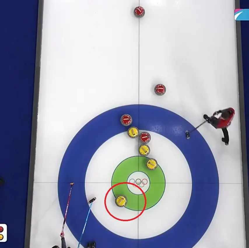令东说念主无法意会的是,王芮的临了一投如同梦游。她投出了一个过了圆心的壶(红圈标示),如下图: