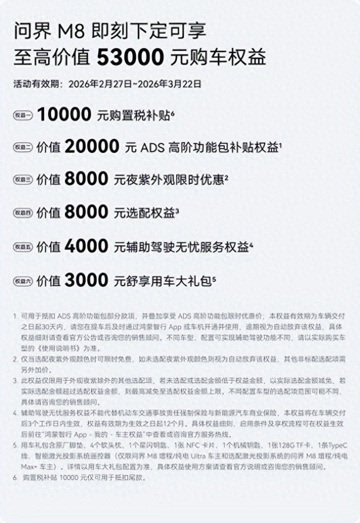 当下,春意渐盛、暖意渐浓,正是举家出游的好时节。为让更多家庭用户尽享春日出行好意思好,问界M8非凡推出3月限时购车职权,2026年2月27日至3月22日,下定可享至高价值53000元购车职权,多重补贴重复让利,将进一步裁减高端机灵出行门槛,助力家庭用户恬逸拥享旗舰级出行体验。