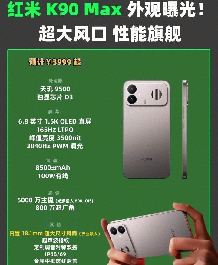 红米K90 Max展望本月月底认真发布,这款被官方界说为“超大风口性能旗舰”的手机,以天玑9500处理器、内置18.1mm超大尺寸电扇、8500mAh电板等中枢建树,从头界说了高性高手机的技能范围。其展望3999元起的订价,更让这款搭载多项“行业最大”技能的机型成为中高端市集的焦点。