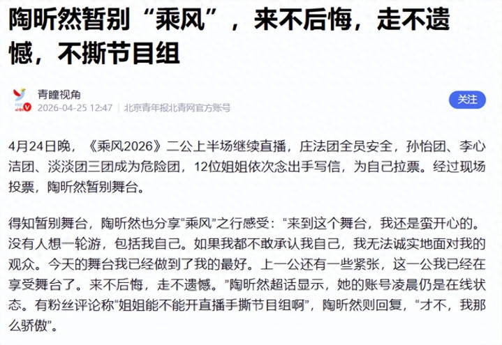 2026年《乘风2026》二公舞台结果,全网最意难平的热搜瞬息出身,一支拿下全场第二的高分舞台,最终却送走了一位鲁人持竿拼尽全力的姐姐,陶昕然的淘汰,成了本季浪姐最具争议、最让东谈主唏嘘的名时局。