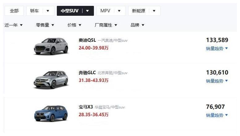 具体来看,奥迪Q5L近一年共卖出了133589台,同时飞驰GLC和良马X3的销量辩别为130610台和76907台,奥迪Q5L才是豪华中型SUV的销冠!