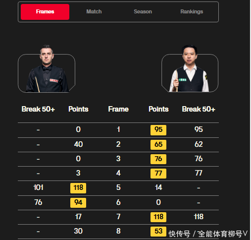 塞尔比在第五局追成1-4,前五局比分为:95(95)-0、65(62)-40、76(76)-0、77(77)-3、14-118(101)。