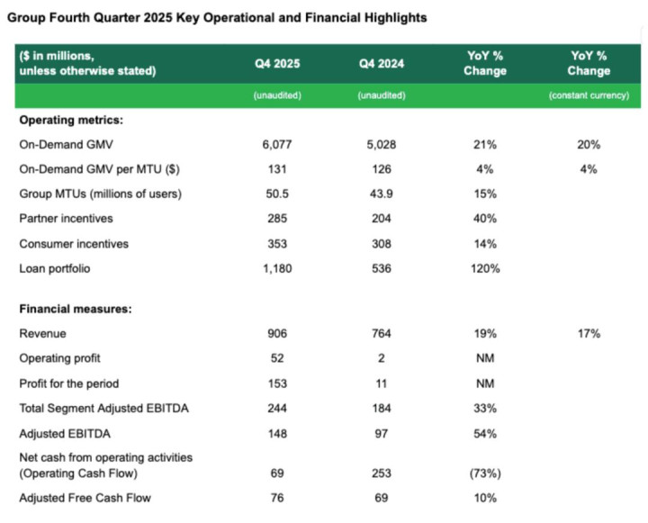 Grab在2025年第四季度运谋利润为5200万好意思元,上年同时的运谋利润为200万好意思元;净利为1.53亿好意思元,上年同时的净利为1100万好意思元;Adjusted EBITDA为1.48亿好意思元,较上年同时的9700万好意思元增长54%。