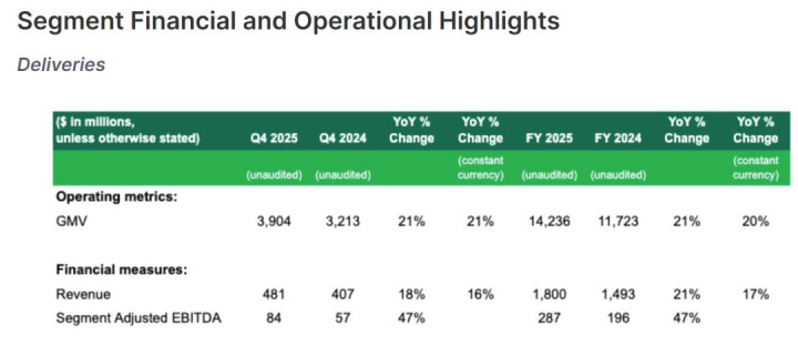 Grab在2025年第四季度来自配送部门的经转变EBITDA为8400万好意思元,较上年同时的5700万每一增长47%;2025年来自配送部门的经转变EBITDA为2.87亿好意思元,较上年同时的1.96亿好意思元增长47%。