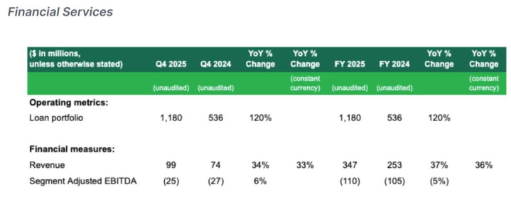 Grab在2025年第四季度来自放贷的收入为9900万好意思元,爱游戏app较上年同时的7400万好意思元增长34%;来自Adjusted EBITDA为-2500万好意思元,上年同时为-2700万好意思元;全年来自放贷的收入为3.47亿好意思元,较上年同时的2.53亿好意思元增长37%;来自放贷部门的Adjusted EBITDA为-1.1亿好意思元,上年同时为-1.05亿好意思元。