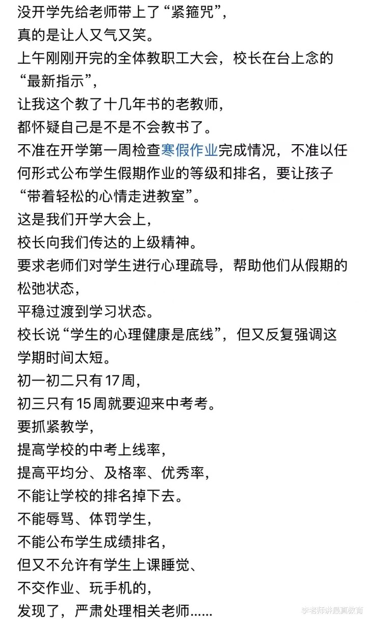 这样的成果即是临了压力齐给了老师,归正老师们不可严格处理学生,也不可多交接功课,也不可公布学生收获,关联词收获差了、学生上课寝息了齐是你老师的包袱。莫得东说念主体恤老师奈何办?莫得东说念主教老师奈何上课?那是你老师的事!
