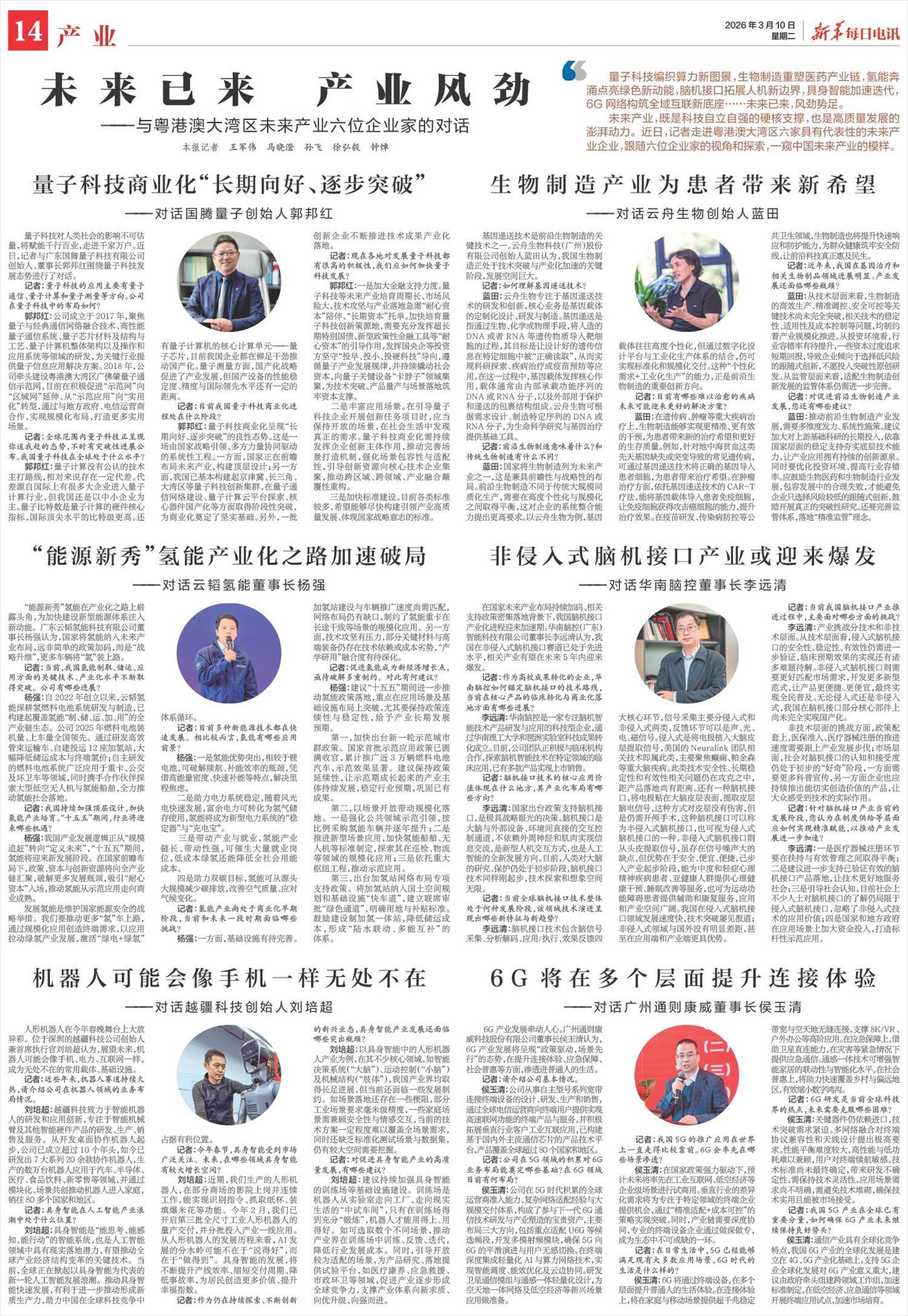 描摹了广州科技立异与产业交融的生动践诺。循着明天产业的期间风口,眼神再次投向粤港澳大湾区,新华社记者与六家代表性明天产业企业伸开深度对话。本文及第了其中五家广州企业的对话内容,呈现它们在量子科技、生物制造、氢能、脑机接口、6G等赛说念上的立异探索与实干动作。